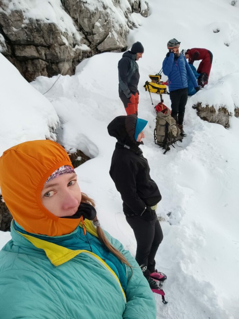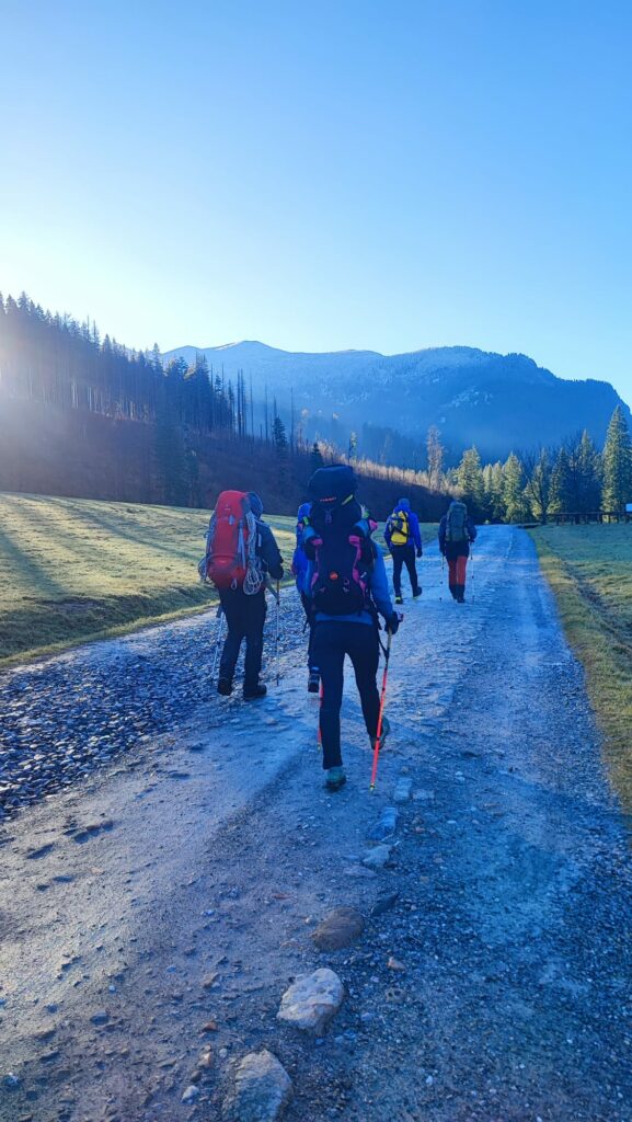 Rano 7:46 dopijam kawę u wylotu Kościeliskiej, poddani się powoli schodzą, Instruktor tez już jest. Pogoda idealna. Rozdzielamy sprzęt, jako cesarz sprawiedliwy nie dzielę po równo. Równo to mamy ważyć z plecakami żeby się dobrze szło, ja ważę 80, dziewczyny niech będzie, że po 40 więc dla nas chłopaków brakło sprzętu, dobrze że chociaż na powrocie liny były mokre, to dziewczyny mogły sobie wodę między plecakami wyrównać. Kolejnym cesarzom polecam zabrać stalowe karabinki, są lepsze do wyważania poddanych.